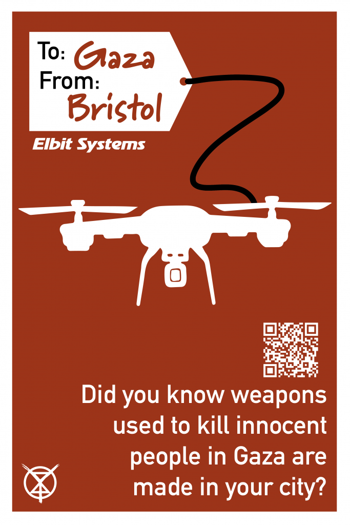 Elbit is Israel’s largest privately owned weapons manufacturer. They manufacture bullets, drones, combat vehicles, electronic warfare systems and missiles. They produce 85% of the land-based equipment and drones used by the Israeli military. On April 1st, an Elbit Hermes 450 drone was used to target cars taking food to Gaza, killing 7 aid workers. Elbit have publicly advertised in the past that their weapons are ‘battle-tested’ in Gaza. They also have a HQ in Bristol and they make some of those weapons here too.
